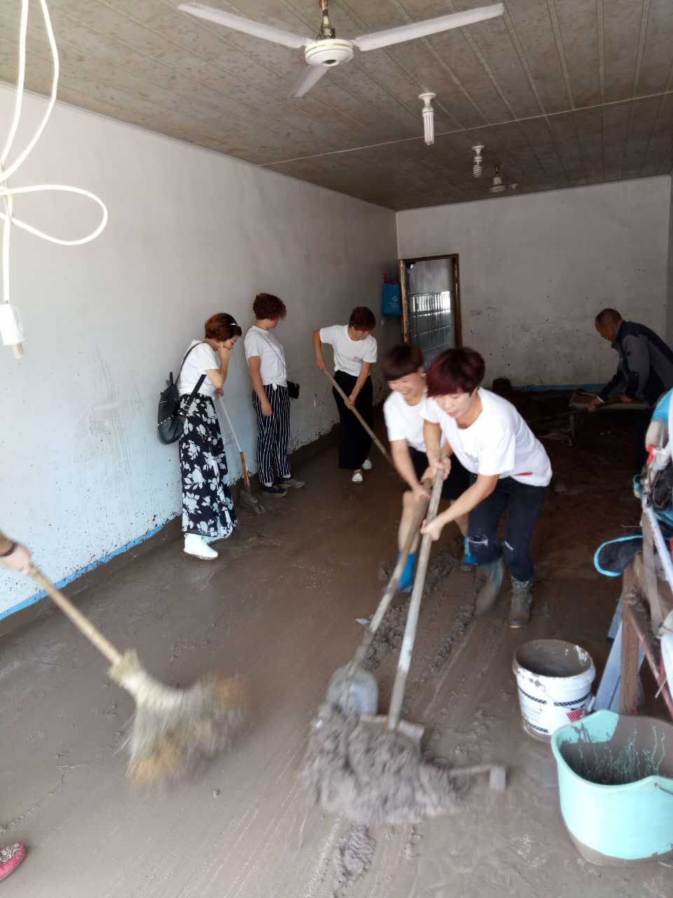 在此次愛心捐贈途中,小組成員們無意間看到一位70多歲的老爺爺,他正在清理家里地面上洪水沖過后留下的一層厚泥土,年邁的身體頗為吃力。見此情景,她們立即來到老爺爺家,拿起鐵鍬、掃帚等工具幫老爺爺打掃和處理家里的泥土。所有成員齊心協(xié)力、汗流浹背,半小時后將老爺爺家的地面收拾的一干二凈,老爺爺對浪莎家人的幫助非常感恩,連聲道謝。